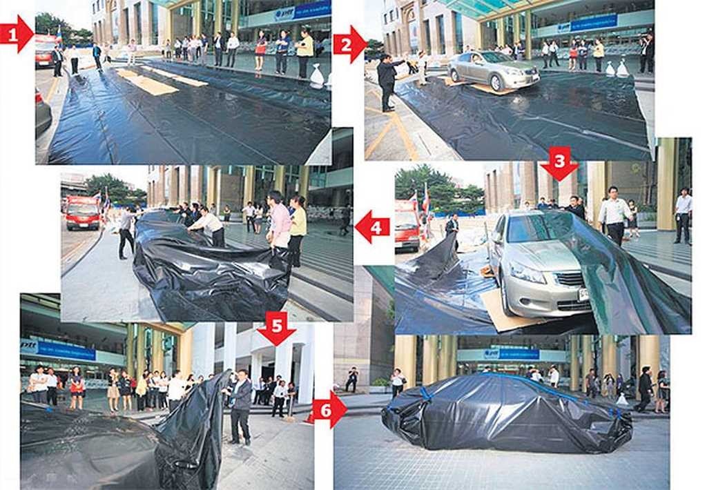 Das Fahrzeug wird einfach auf die Folie gefahren und verpackt. Anschließend wird die Folie mit einem Reißverschluß oder mit Seilen geschlossen. Die Folie ist 1,5 mm dick und soll für 900 Baht verkauft werden.