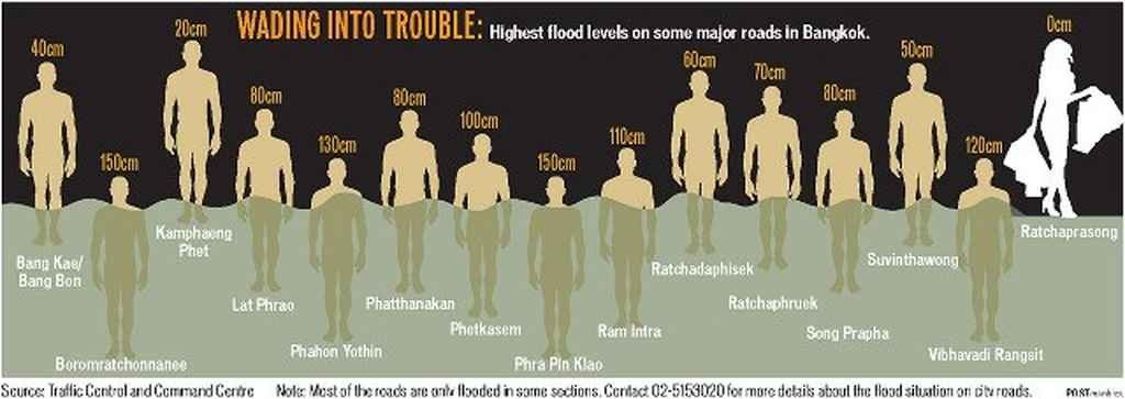pp Bangkok. Anhand der Grafik lassen sich die Hochwasserstände auf den wichtigsten Straßen in Bangkok sehr gut erkennen und ablesen.