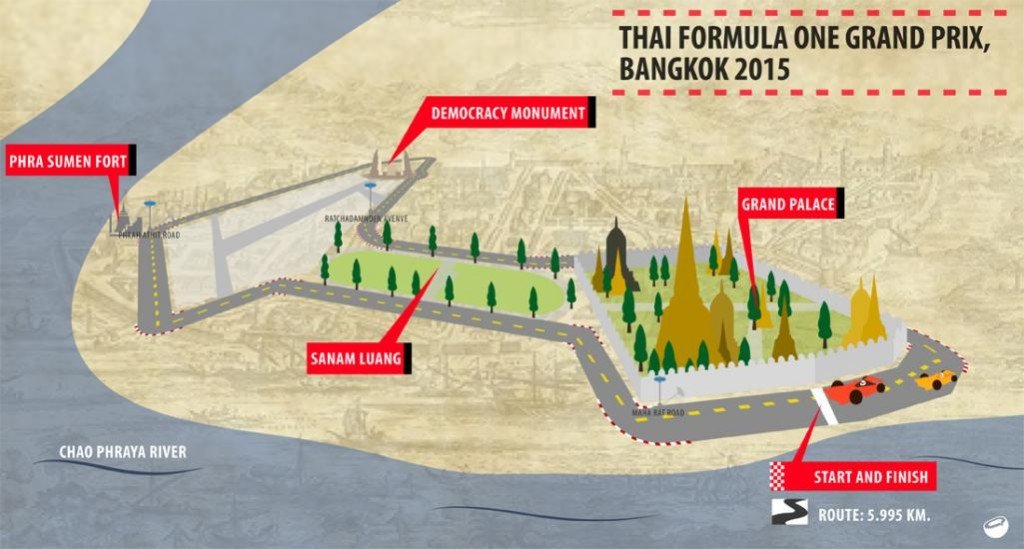 pp Bangkok. Laut dem Gouverneur der „Sports Authority of Thailand“, hat eine Gruppe von internationalen Experten eine 5,995 km lange Strecke in Bangkok für ein Formel 1 Rennen ausgewählt. Das erste Rennen soll bereits 2015 ausgetragen werden.