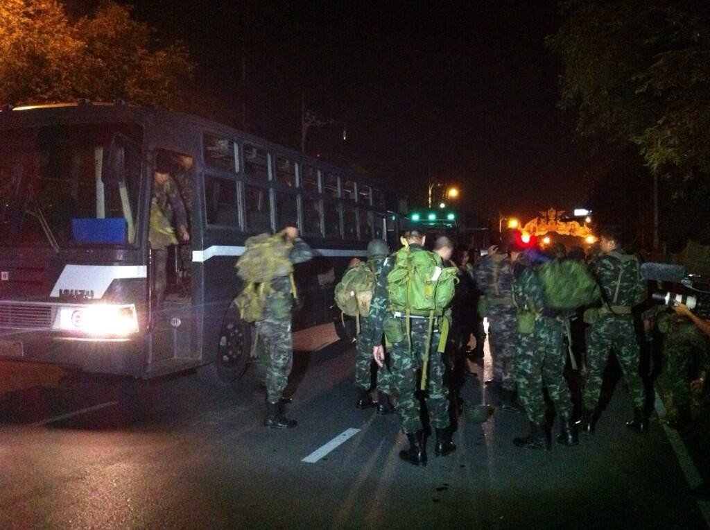 Nachdem die Lage dann unübersichtlich wurde, ordnete die Regierung das Eingreifen des Militärs an. Zunächst sollten 17, später dann 19 Kompanien und 180 Militärpolizisten ausrücken, um die Sicherheit der Hauptstadt zu gewährleisten. Dabei sollten vor allem die beiden Flughäfen Suwannaphum und Don Mueang sowie die Fernsehstationen geschützt werden.