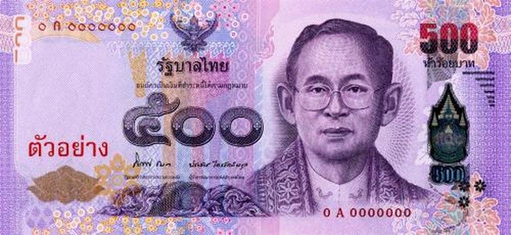 Die neue 500 Baht Geldnote sieht ähnlich aus wie die anderen der 15.ten Serie von 20 und 50 Baht Geldscheinen. Auf der Vorderseite ist nach wie vor ein Porträt Seiner Majestät König Bhumibol Adulyadej zu sehen.
