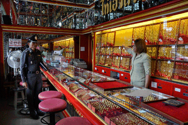 Das Personal habe unter Schock gestanden und mit angesehen wie der Mann die Scheibe einer Wandvitrine zerschlagen habe. In der Vitrine befanden sich schwere Goldketten mit einem Gewicht von vier bis fünf Baht. Der Räuber habe sich kurzerhand zwei Schalen mit den Goldketten gepackt und sofort danach das Geschäft verlassen. Dann habe er sich auf seine Honda geschwungen und sei davon gebraust. Die Verkäuferin schätzt, dass der Täter rund 40 Goldketten gestohlen hat.