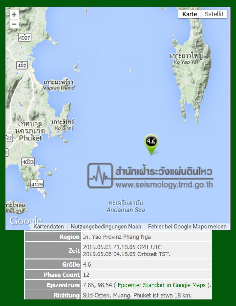 pp Phuket. Wie von uns gemeldet kam es am Mittwochmorgen gegen 4.18 Uhr zu einem Erdbeben der Stärke 4,6 dass in Phuket viele Bewohner aus dem Schlaf riss.