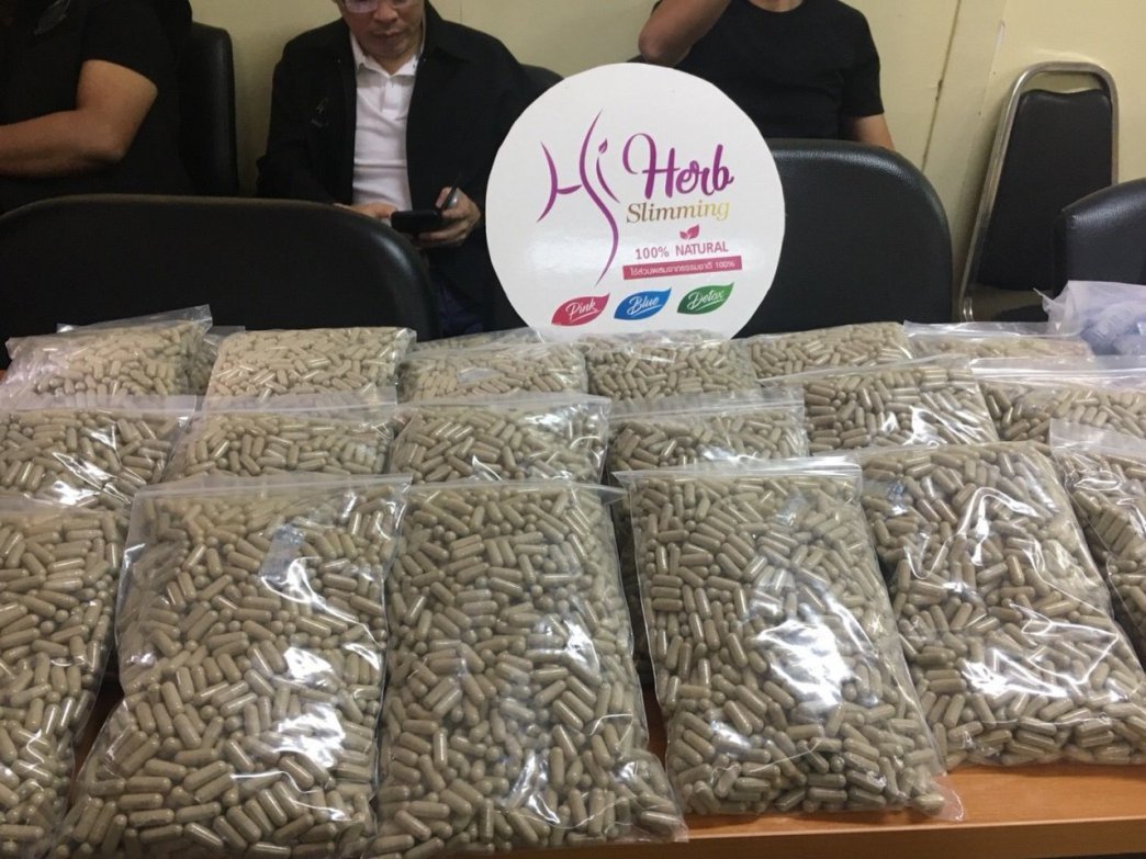 DSI-Chef Polizei Oberst Kornwat sagte auf der Pressekonferenz, dass die beiden Verdächtigen beschuldigt werden, Inhaber einer Firma zu sein, die illegale Mittel zur Gewichtsabnahme, als Nahrungsergänzungsmittel verkleidete Drogen verkauft haben.