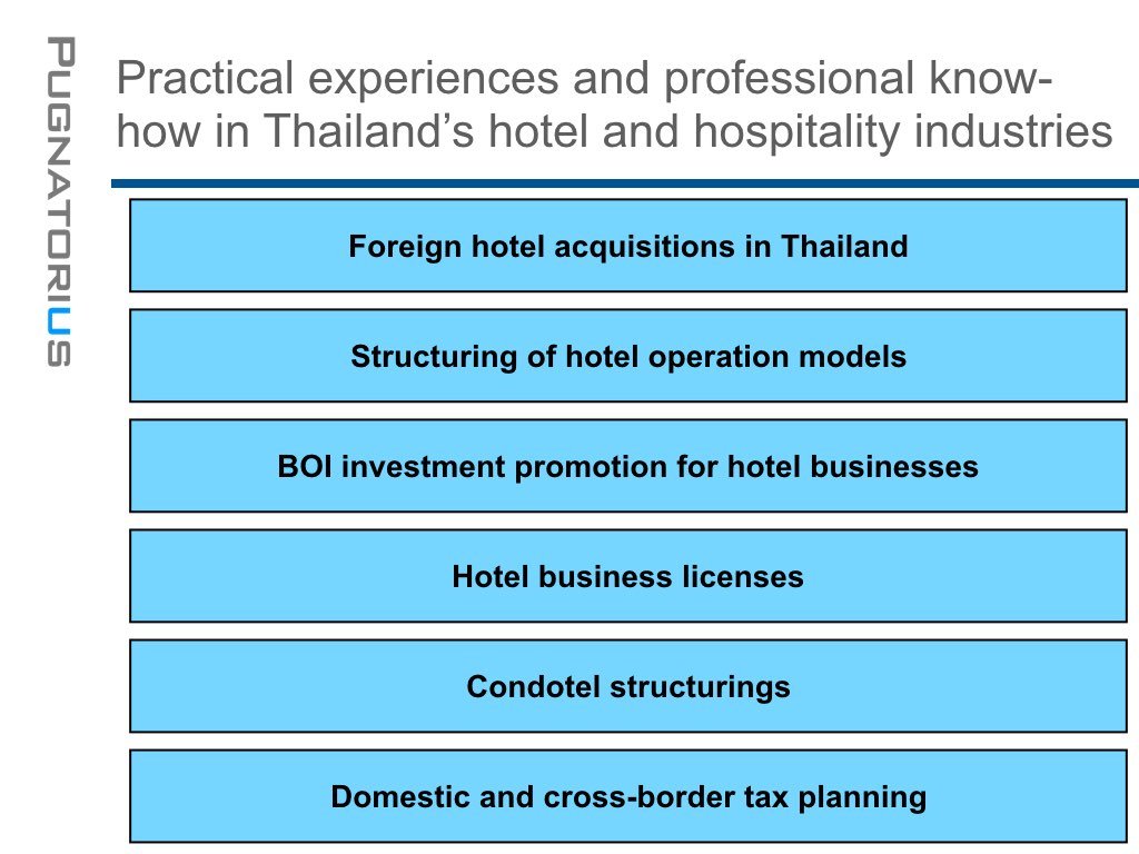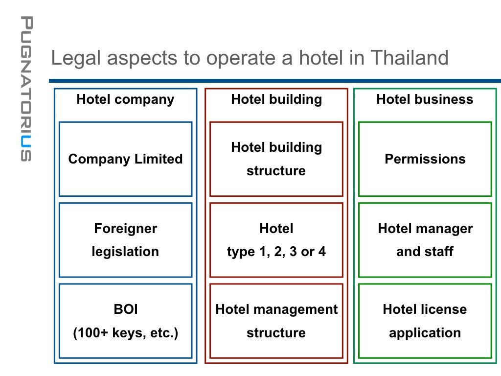 Schritt 2: Das Hotelgeschäft. Eine Investitionsförderung durch die Investitionsbehörde (BOI) ist in der Kategorie 7.4.3 (Hotels) möglich. Dazu muss die Hotellerie über mindestens einhundert Schlüssel (Schlüssel bedeutet Zimmer) oder eine Mindestinvestition (ohne Grundstücks- und Betriebskapitalkosten) von mindestens 500 Mio. Baht verfügen. Die BOI-Förderung erfordert eine neue Investition, weshalb ein bestehendes Projekt nicht ohne weiteres förderfähig ist.