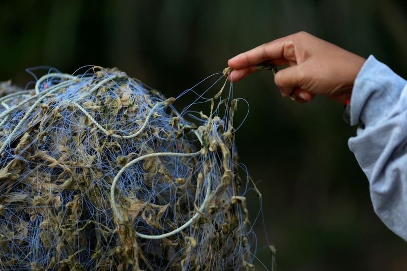 Am Freitag werden Algen in einem Fischernetz in der Nähe des Mekong-Ufers außerhalb von Nong Khai gesehen. (Foto von Reuters)
