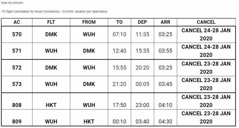 Sechs weitere Flüge von Thai AirAsia, die vom 23. bis 28. Januar von und nach Wuhan zu den Flughäfen Don Mueang und Phuket fliegen sollen, wurden bereits annulliert.