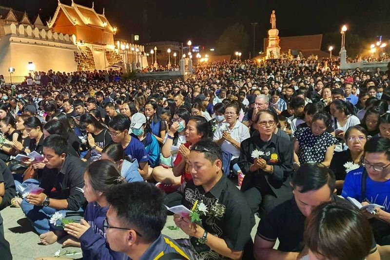 Tausende Einheimische zündeten am Sonntagabend Kerzen an und beten für Menschen, die bei den Amokläufen im Bezirk Muang in der Provinz Nakhon Ratchasima getötet wurden.(Foto von Prasit Tangprasert)