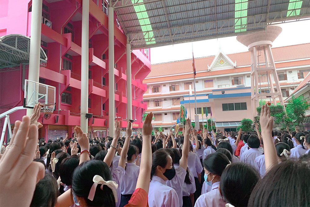 BANGKOK, Die Schüler mehrerer Schulen im ganzen Land haben am Montag (17. August) die tägliche Zeremonie zum Hissen der Flagge zu einem Akt der Solidarität mit den anhaltenden Protesten gegen die Regierung gemacht.