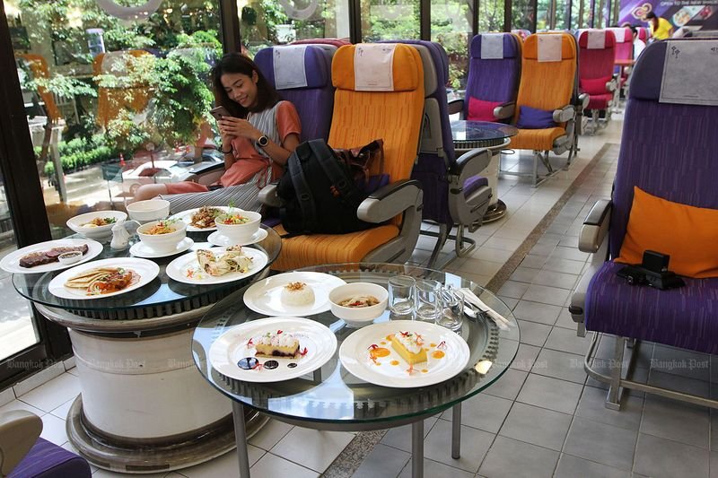 Flug der Phantasie: Ein Diner lehnt sich zurück, während eine Auswahl an Speisen in einem Restaurant, das Thai Airways International am Hauptsitz in Bangkok eröffnet hat, auf Tischen verteilt wird. Das Restaurant ist mit Flugzeugsitzen ausgestattet, mit denen die Kunden das Erlebnis des Bordessens noch einmal erleben können. (Foto von Wichan Charoenkiatpakul)