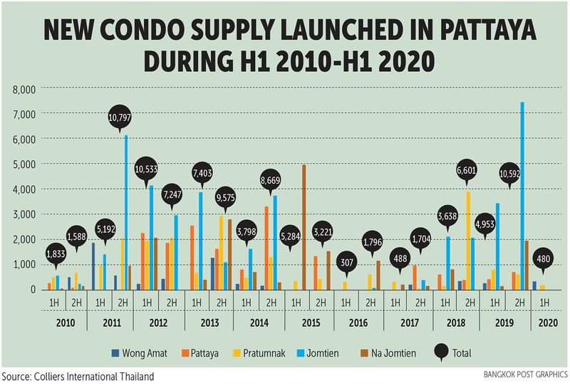 Die Entwickler sollten das Angebot an neuen Eigentumswohnungen in Pattaya einfrieren, da der Ausbruch des Coronavirus die Nachfrage belastet und die Anzahl der nicht verkauften Einheiten auf ein Rekordhoch erhöht, sagte der Immobilienberater Colliers International Thailand.