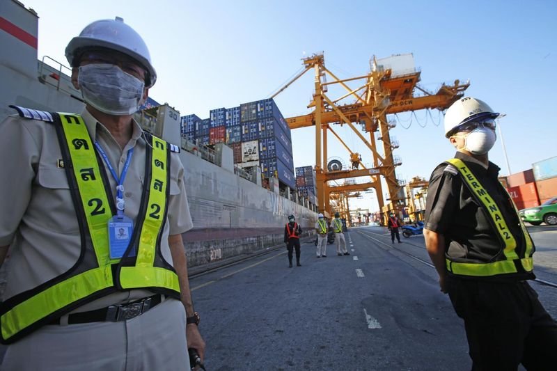 Die Atmosphäre im Hafen von Bangkok, als Beamte Gesichtsmasken tragen. Die Pandemie belastet die Exportaussichten für den Rest des Jahres noch immer. Pornprom Satrabhaya