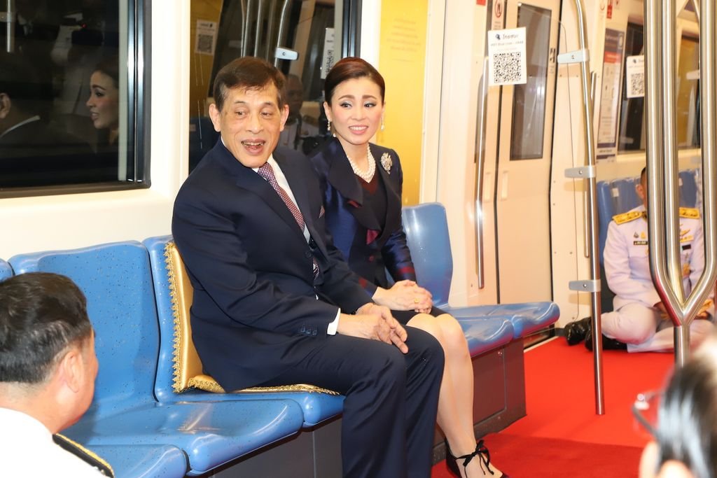 Ihre Majestäten kamen gegen 17 Uhr zur offiziellen Eröffnungsfeier der Erweiterung der Blauen Linie am Bahnhof Sanam Chai an. Sie lächelten und winkten, um eine Menge Leute zu begrüßen, die den Weg vom Museum Siam zum Bahnhof säumten. Gesänge von „Es lebe der König“ wurden gehört, als das königliche Paar eintraf.