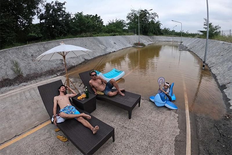 Jitiwat Nakchamsilp kam dann auf die Idee, das Problem in der Öffentlichkeit und in den Medien bekannt zu machen. Herr Nakchamsilp schlug daher vor, die überflutete Straße in eine neue Touristenattraktion in der Region zu verwandeln. Er, ein anderer Mann und ein Mädchen brachten ein schwimmendes Bett, Liegestühle, Angelruten und Picknickausrüstung zur Unterführung, um eine auffällige Nachricht über die monatelange Überflutung in den sozialen Netzwerken zu verbreiten.