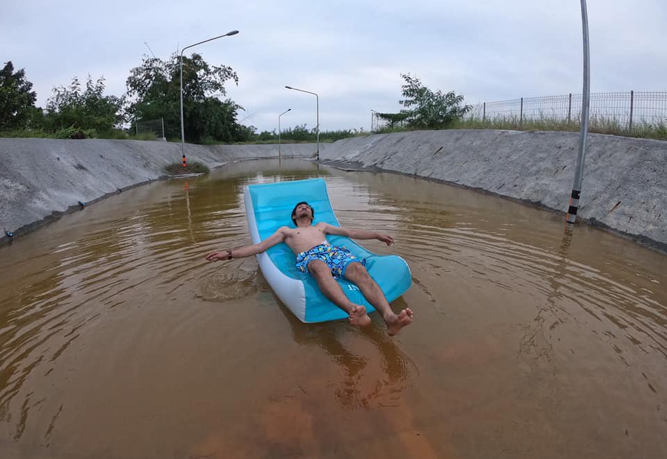 Jitiwat Nakchamsilp entspannt sich in der überfluteten Unterführung. (Foto von Jetiya Nakchamsilp Facebook Konto)