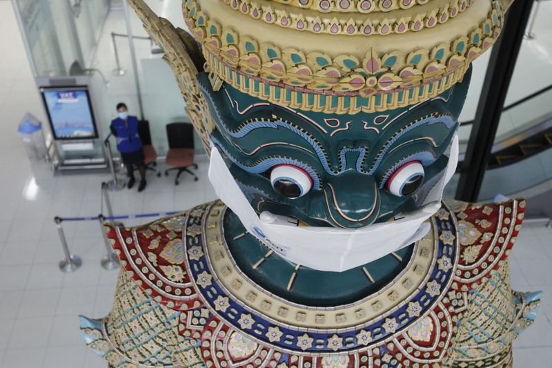 Die „Yak“-Statue am internationalen Flughafen Suvarnabhumi trägt im Rahmen einer Kampagne eine Gesichtsmaske, um die Menschen daran zu erinnern, weiterhin Masken zu tragen und soziale Distanzierung einzuhalten, um die Übertragung von Covid-19 zu verhindern. (Foto: Wichan Charoenkiatpakul)