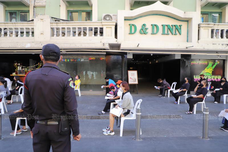 Ein „Thetsakit“-Inspektor der Stadt Bangkok überwacht Büro- und Ladenmitarbeiter in der Khao San Road, die am Donnerstag auf Covid-19 Tests warten. (Foto: Pornprom Satrabhaya)