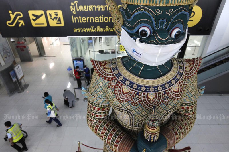 Die „Yak“-Statue am Flughafen Suvarnabhumi trägt im Rahmen einer Kampagne eine Gesichtsmaske, um die Menschen daran zu erinnern, weiterhin Masken zu tragen und soziale Distanzierung zu beachten, um die Übertragung von Covid-19 zu verhindern. (Foto: Wichan Charoenkiatpakul)