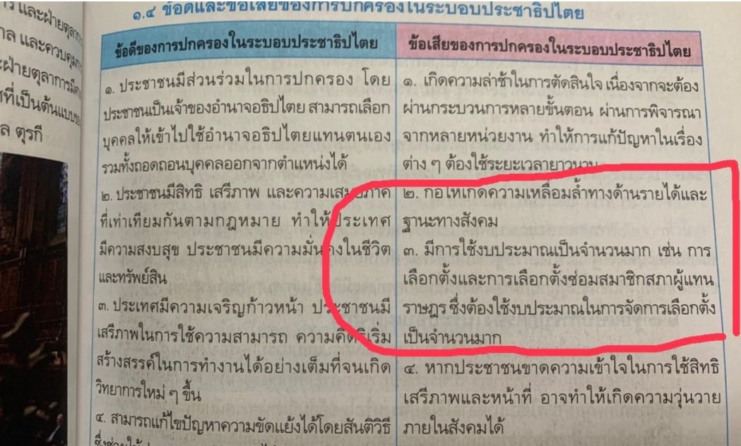 Am Donnerstag (17. Februar) veröffentlichte der Dozent der Ubon Ratchathani Universität, Titipol Phakdeewanich, ein Foto eines sozialwissenschaftlichen Lehrbuchs für Sekundarschüler, das offenbar absichtlich die Demokratie untergräbt. Das Regierungslehrbuch ist seitdem viral geworden.