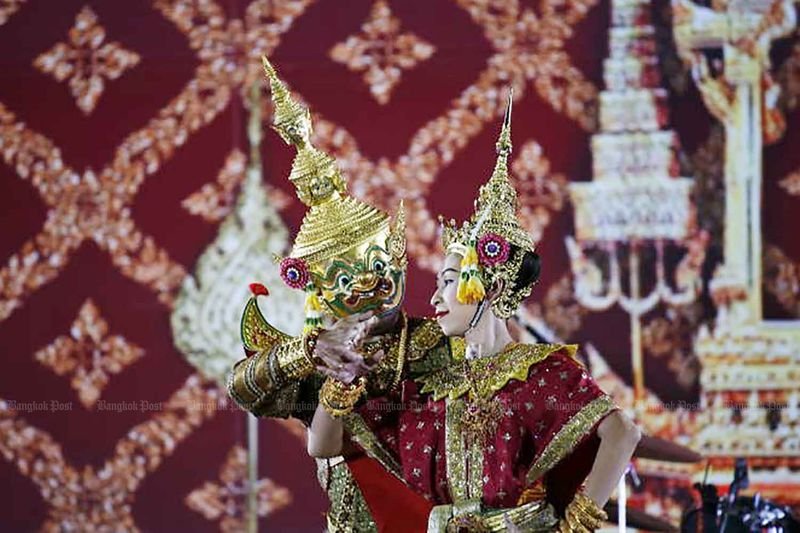 Eine Aufführung von „Khon“, einem traditionellen Maskentanz, der auf dem hinduistischen Epos „Ramakien“ basiert, wird den Besuchern am Sonntag bei der Veranstaltung „Thiew Muang Thai“ gezeigt, die von der Tourismusbehörde Thailands vom 18. bis 22. Februar im Lumpini Park organisiert wird. Die Veranstaltung fand unter Covid Free Setting-Maßnahmen statt. (Foto: Arnun Chonmahatrakool)