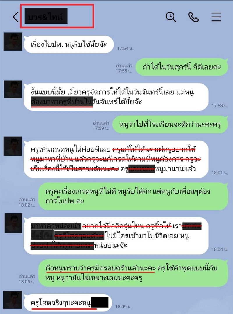 Auf Facebook wird ein angebliches Chat-Gespräch zwischen einem stellvertretenden Schulleiter in Chaiyaphum und einer Studentin gepostet. Der Mann bietet an, die Noten der Schülerin zu ändern, wenn sie ihn in seinem Haus besuchen kommt. Er bietet ihr auch ein Handy an. (Von der Facebook-Seite von Rabnong Sangsan Radab Mahakarn)