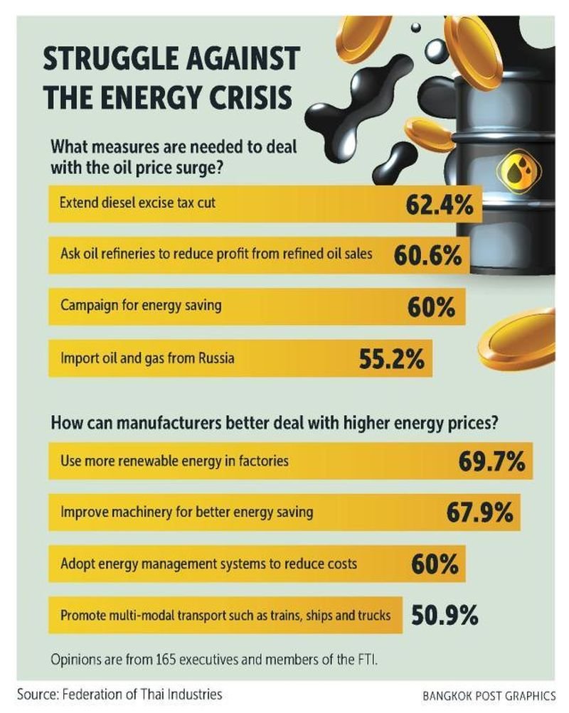 BANGKOK. Die steigenden Energiepreise geben Anlass zur Sorge. Höhere Energiepreise haben die Produktionskosten um 20 % in die Höhe getrieben, aber die Hersteller konnten die Warenpreise um weniger als 10 % erhöhen, da sie Schwierigkeiten haben, das Verkaufsvolumen aufrechtzuerhalten, so die jüngste Umfrage der Federation of Thai Industries (FTI).
