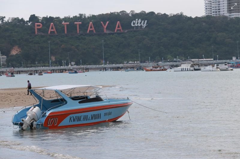 Ein Schnellboot ankert an einem Strand in Pattaya, Chon Buri, wo es derzeit eine große Anzahl unverkaufter Eigentumswohnungen gibt. Somchai Poomlard