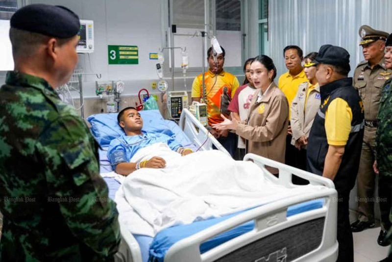 Die suspendierte Premierministerin Paetongtarn Shinawatra und der stellvertretende Verteidigungsminister General Nattaphon Narkphanit besuchen am 18. Juli den verletzten Privatdetektiv Thanapat Huiwan im Fort Sunpasitthiprasong Krankenhaus in Ubon Ratchathani, nachdem ihm einer der Füße durch eine Landmine abgerissen wurde.