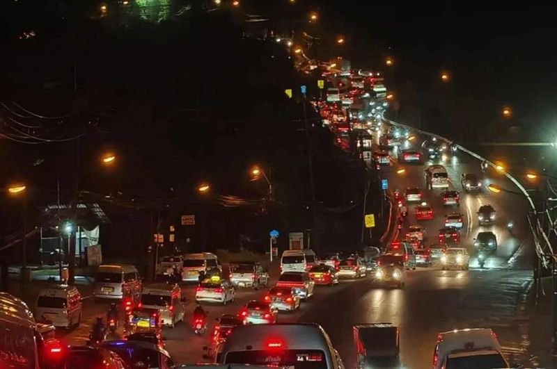 An einem Sonntagabend stauen sich die Fahrzeuge auf der bergauf führenden Straße nach Patong in Phuket. Die Behörden von Phuket bekämpfen die Verkehrsprobleme. (Foto: Sitthichai Jaipiam Facebook-Account)