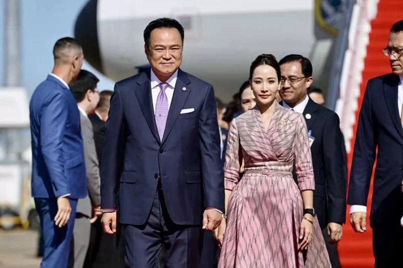 Premierminister Anutin Charnvirakul und seine Ehefrau Thananon Niramit treffen am 16. Oktober auf dem internationalen Flughafen Wattay in Vientiane, Laos, ein. (Foto: Regierungssitz)