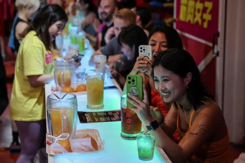 Chinesische Kundinnen fotografieren während einer Aufführung in der Fitnessbar Muscle Girls in Tokio am 25. Juli 2025. (Foto: Reuters)