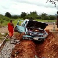 Kanchanaburi . Ein Pick-up Fahrer und zwei Mönche entkamen wie durch ein Wunder dem Tod, als ihr Fahrzeug von einem Zug gerammt wurde.