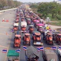 Rund 500 Bauern mit ihren Traktoren auf dem Weg zum Flughafen Suwannaphum