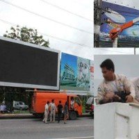 Drei Arbeiter waren am Freitagnachmittag mit dem Anbringen einer riesigen elektronischen Anzeigetafel in der Nähe der Central Festival Kreuzung beschäftigt.