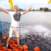 pp Bangkok. Die meisten Tempelbesucher bringen zur Fischfütterung einen Laib Brot oder eine Schüssel mit Trockenfutter mit. Nicht so dieser junge Mann. Er ist mehr als Großzügig.